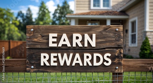 © Erlinda, Fototapeta premium earn rewards lettering on sign at fence with house background