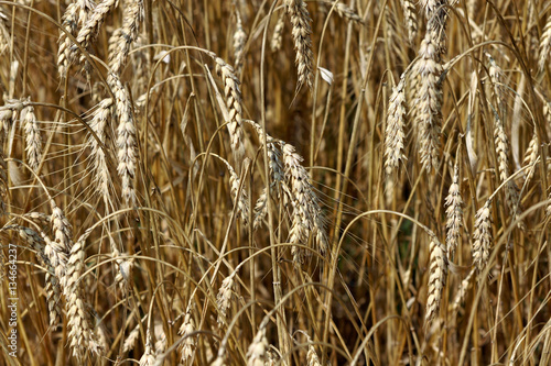Fototapeta premium Ears of golden wheat closeup in sunny summer day - abstract background