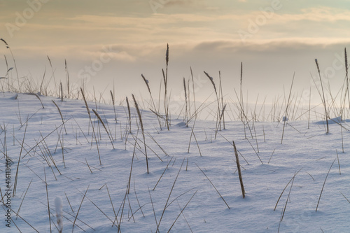 Fototapeta premium Ears of grass on the southern shore of Kotlin Island, covered with snow after...