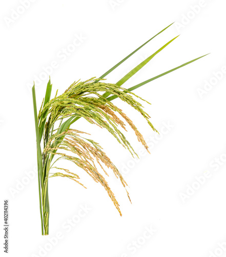 © sucharat, Naklejka premium Ears of paddy rice grain isolated on white background