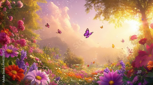 © Friendly Studio, Obraz premium Earth amid garden blooms, touched by delicate purple butterflies
