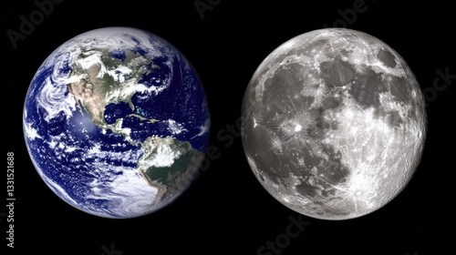 © Anuphong, Fototapeta premium Earth and Moon in Space Detailed View of Planetary Surfaces