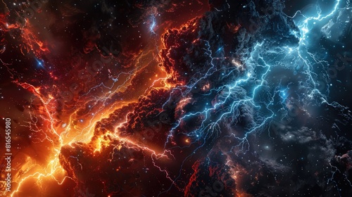 © Achmad Khoeron, Obraz premium Earth apocalypse concept. Fire and ice space lightnings
