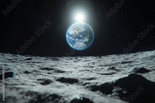 © bartjan, Obraz premium Earth appearing as a bright blue and white marble hovering in the void, as seen from the moon's surface