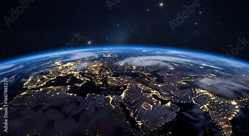 © alisa family, Obraz premium Earth at Night: Detailed global view from space showing bright city lights across Europe and the Middle East, with a prominent hurricane swirling over the Black Sea region and a starry cosmos.