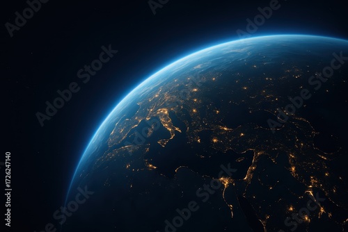 Obraz premium Earth at night from orbit glowing city lights over continents atmospheric...
