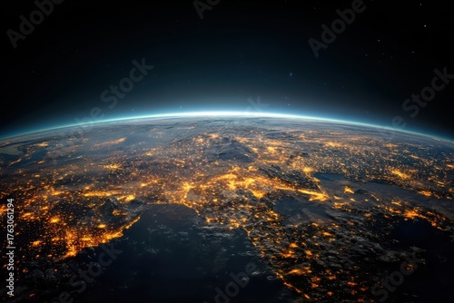Obraz premium Earth at Night from Space View of City Lights and Atmosphere Perspective of...
