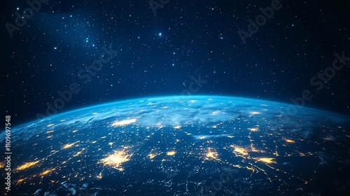 Obraz premium Earth at night, seen from space, with city lights illuminating continents.