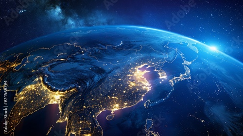 © Panupan, Obraz premium Earth at Night with City Lights and Milky Way Galaxy