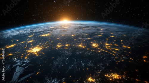 © jodoto, Obraz premium Earth at Night with City Lights Illuminated Under a Stunning Sunrise from Space