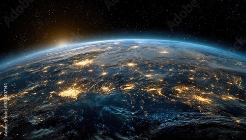 Obraz premium Earth at night, with city lights illuminating continents. Sunrise peeks from...