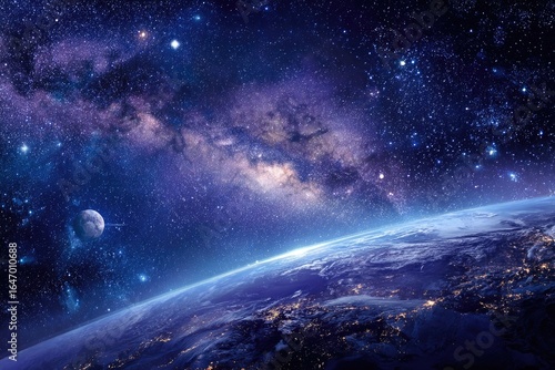 Fototapeta premium Earth bathed in cosmic light, galaxy overhead
