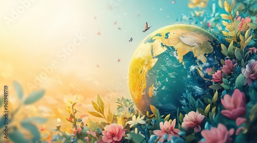 Naklejka premium Earth cradled in flowers and butterflies, symbolizing harmony between nature and planet. Hopeful vision of environmental care and sustainability.
