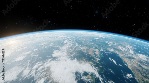 © siraphol, Obraz premium Earth curvature seen from space, showcasing serene clouds and distant stars