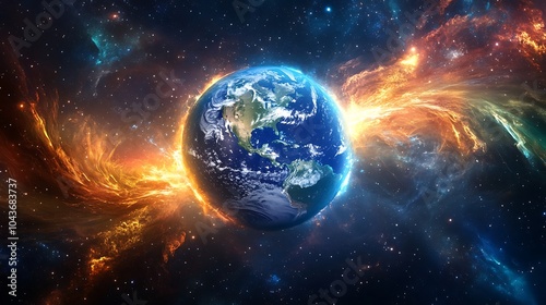 Fototapeta premium Earth floating in space with swirling dust and bright light streaks surrounding it
