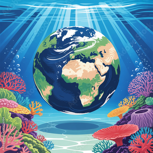 Naklejka premium Earth floating underwater surrounded by colorful coral reefs and ocean sunlight