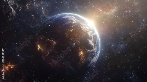 © Pannee, Fototapeta premium Earth from a distant perspective in space, surrounded by stars and illuminated by the sun.