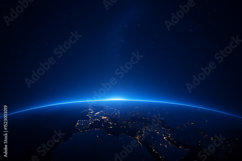 Obraz premium Earth from Space at Night with City Lights and Glowing Atmosphere