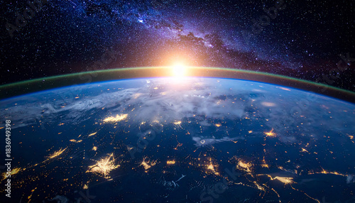 © soyibakter, Fototapeta premium Earth From Space at Sunrise with City Lights and Milky Way Galaxy night