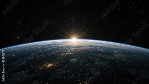 Obraz premium Earth from space at sunrise with visible city lights and starry night sky....