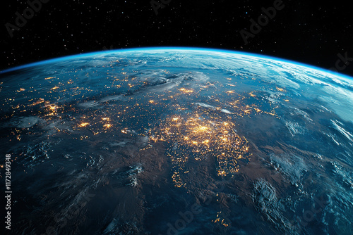 Fototapeta premium Earth from space Europe at night, city lights glow, stars shine