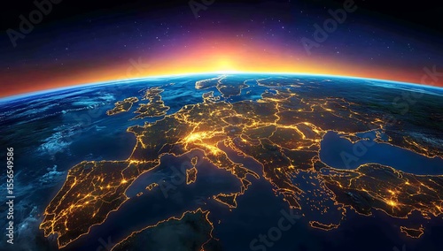 © Hellal khan, Fototapeta premium Earth from Space Europe Illuminated Cities at Night with Sunrise Horizon image