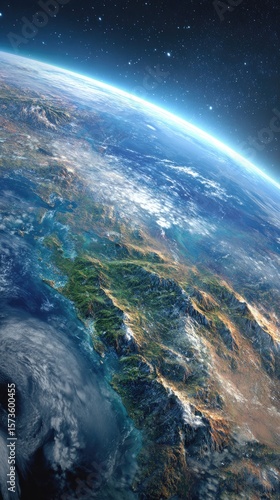 Fototapeta premium Earth from space showing vibrant blue oceans, green and brown mountainous terrains, white cloud