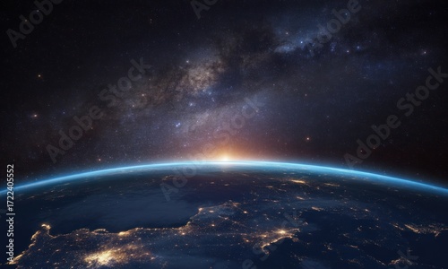 Obraz premium Earth from space, sunrise, Milky Way. Vast expanse of space, dotted with stars. Earth's swirling atmosphere, lit by sunrise