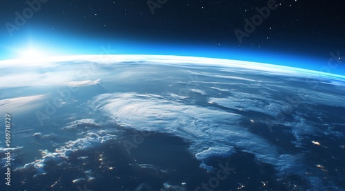 Fototapeta premium Earth from Space View with Black Sky and Stars, Featuring a Round Planet with...