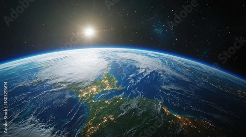© Kopi, Fototapeta premium Earth from space with bright sun and cloud cover