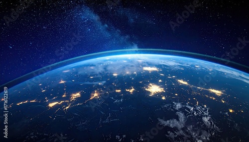 © doaibu, Fototapeta premium Earth From Space With City Lights Glowing Under a Swirl of Clouds and Stars in a Dark Blue Space Background Under a Horizon