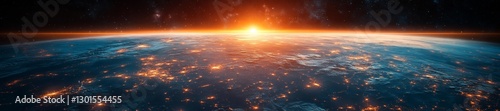 © Alexey, Naklejka premium Earth from Space with Glowing Horizon at Sunrise. Generative AI