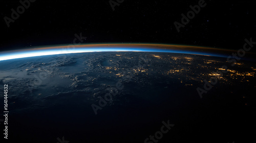 Fototapeta premium Earth from Space with Horizon Arc, Sunlit Clouds, City Lights, and Golden Sun...