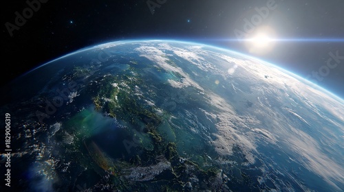 Fototapeta premium Earth from space with visible sun glare and clouds atmosphere planet.