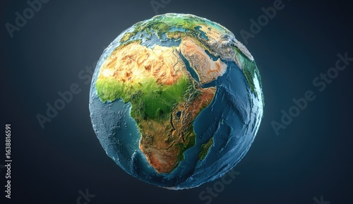 Fototapeta premium Earth globe, continents, topography, 3D render, dark background,...