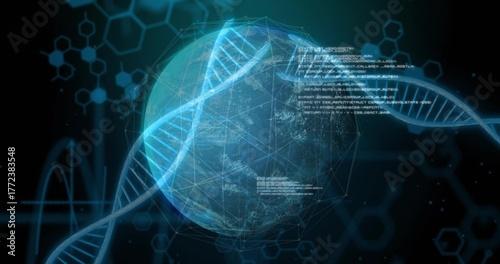 Fototapeta premium Earth globe rotating in virtual interface, with DNA helix, network grid and code fragments