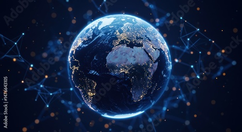 Obraz premium Earth globe surrounded by interconnected network nodes against a dark blue...