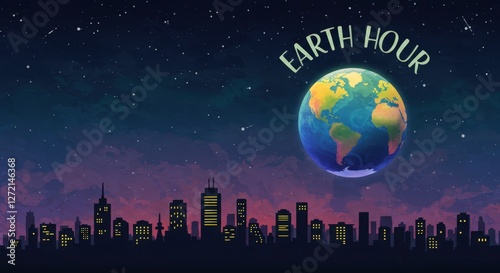 © Katsyarina, Naklejka premium Earth Hour celebration with city skyline and glowing planet Earth under starry night sky