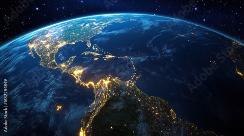 Fototapeta premium Earth illuminated at night with visible light trails from major cities and highways, realistic satellite perspective above South America