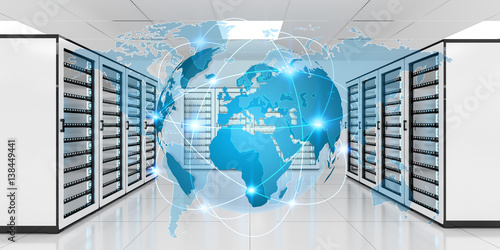 © sdecoret, Obraz premium Earth network flying over server room data center 3D rendering