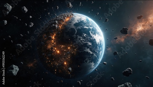 © miss irine, Fototapeta premium Earth planet breaks apart in deep space, asteroids fly around. One side shows bright city lights, other shows dark crumbling surface. Catastrophe.