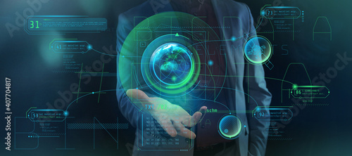 © conceptcafe, Obraz premium Earth projection with infographic data over palm.
