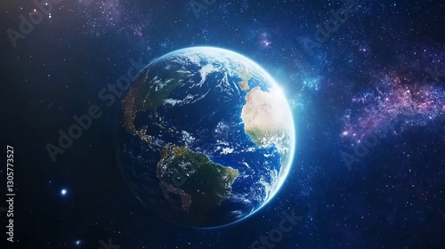 © Nataliia, Obraz premium Earth rising over distant galaxy, soft glowing light, vibrant deep blues and purples, and vast expansive cosmic atmosphere, side angle shot.