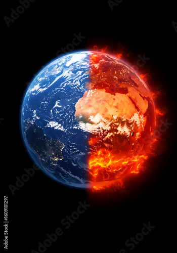 Fototapeta premium Earth's duality: one side thriving, the other consumed by an alarming fiery climate change