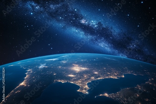 Fototapeta premium Earth's night lights, Milky Way backdrop, space view, planet