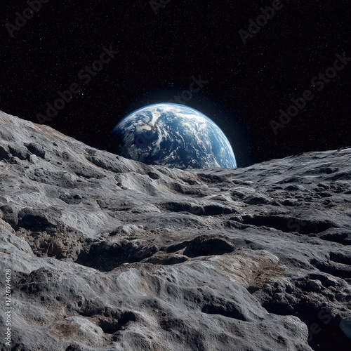 © Kahartakhassus, Obraz premium Earth seen from a rocky lunar landscape. Vast expanse of gray, cratered moon surface with Earth in the distance