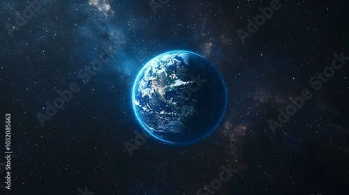 Obraz premium Earth Seen from Distant Alien Perspective as Glowing Blue Gem in Vast Cosmic...