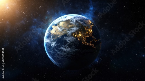 Fototapeta premium Earth seen from space, shining brightly against a starry backdrop.
