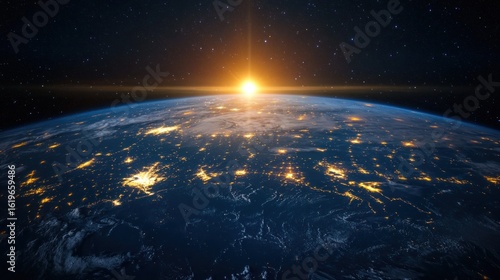 © Eko, Obraz premium Earth seen from space with a sunrise, showing city lights.