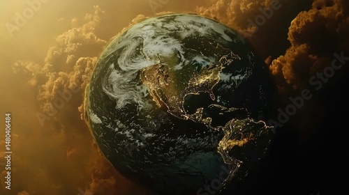 © Manto, Obraz premium Earth surrounded by a hazy, golden cloud.